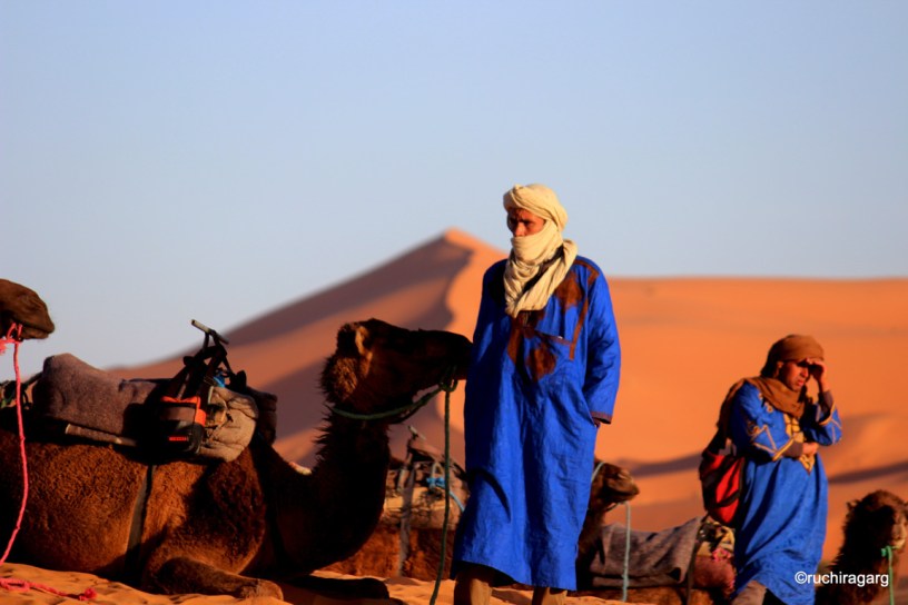 We left our bus at Erfoud and headed in smaller SUVs to Merzouga to experience the Sahara desert. Saleem made sure we wasted no time so that we didn’t miss the sunset. We just made it in time. The bumpy camel ride over the dunes gave us some sores but it was hilarious as we clung onto the camel back for dear life. Surprisingly the camels did not have names. The guides asked us to give them names and most of us named them after the Bollywood Khans especially considering the fascination Morocco has for Shahrukh Khan. The sunset was mesmerizing as anticipated. The Sahara dunes are more pristine than what I have seen in Rajasthan and Dubai. This is probably because they do not allow vehicles to go over the dunes to preserve their natural beauty. Though we didn’t want to leave, the desert began to look scary after the sun set and we headed back to our resort in Merzouga.