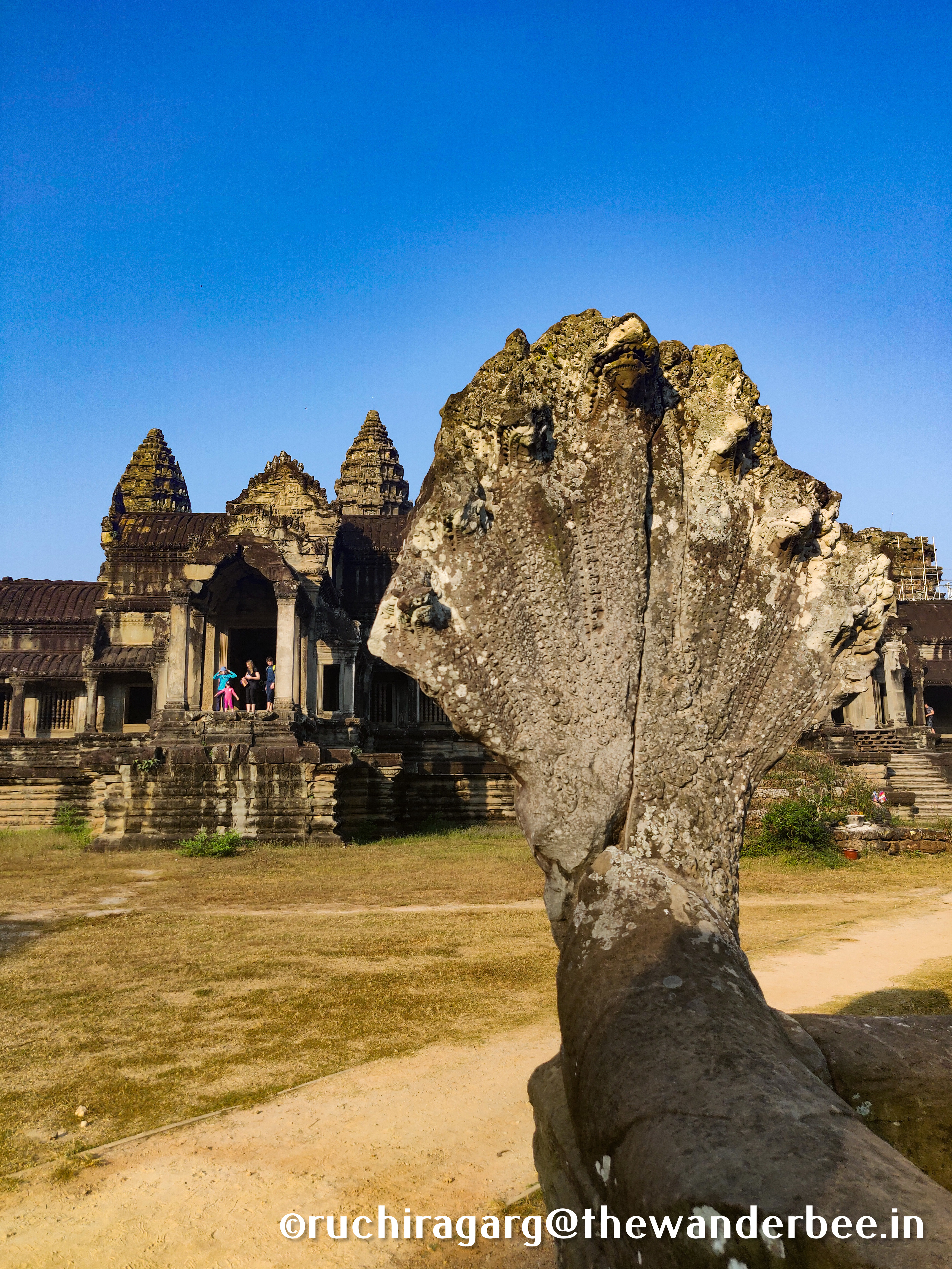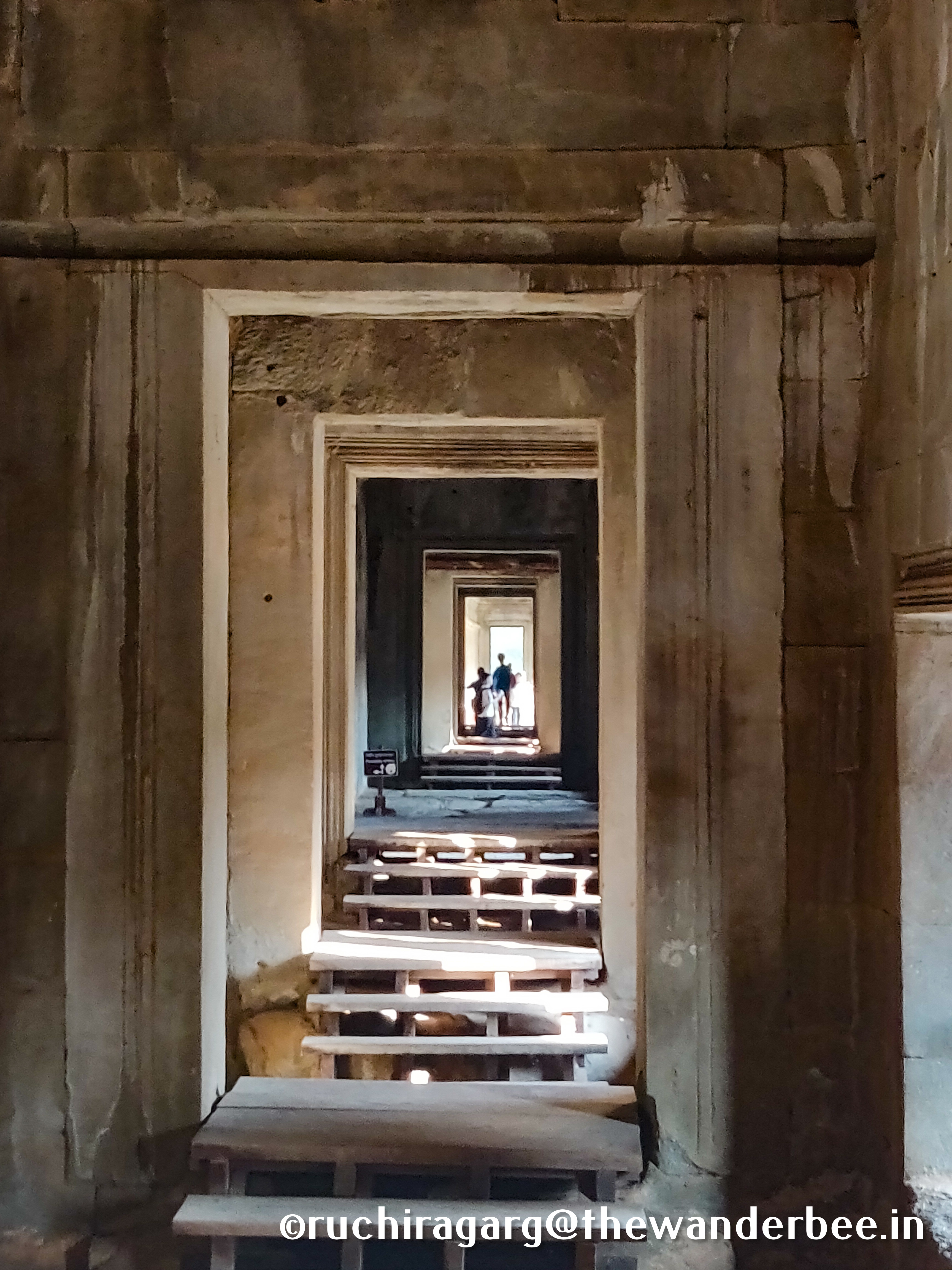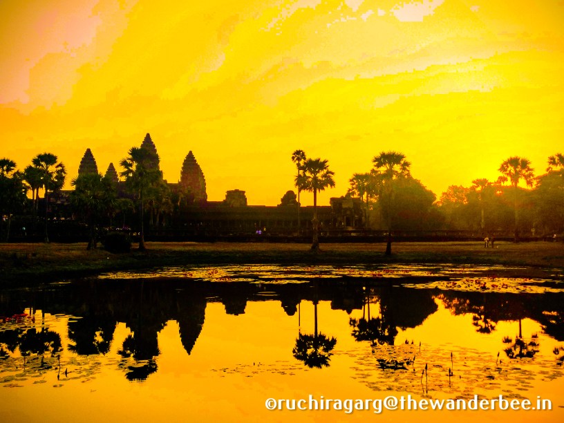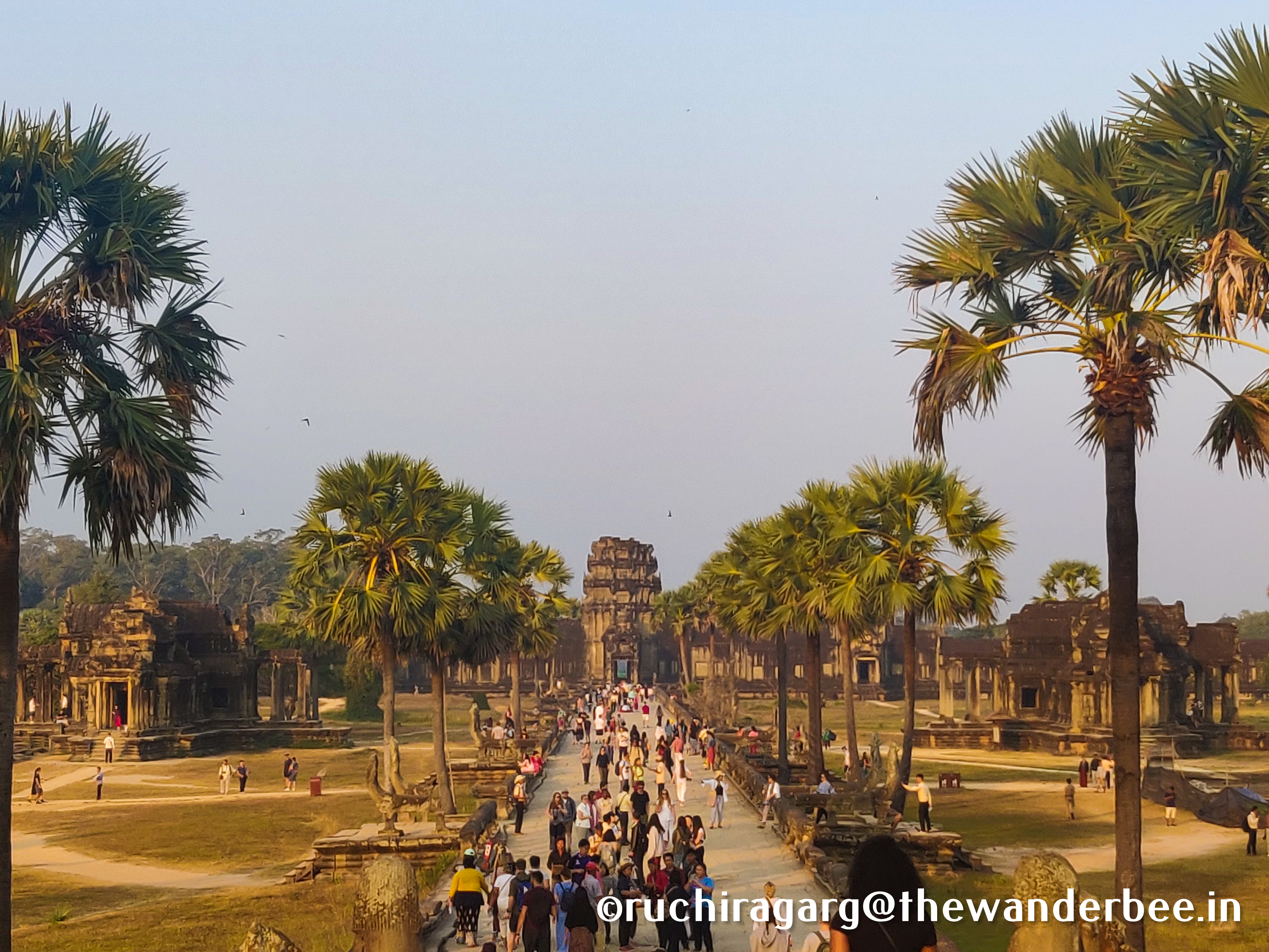 The next day we went early in the morning to watch the sunrise at Angkor Wat. Well I should add that there were 2000 others there to watch the sunrise so expect a huge crowd. To add to the dramatic impact of the sunrise, there are no lights in the entire temple premise so one needs to walk through the pitch-dark path to get near the temple. Thanks to our guide who suggested that we sit at a place which had huge stone slabs to watch the sunrise vs jostling with the crowds at the pond next to the temple to watch the reflection. The concept of watching the sunrise reflection in the pond is so overhyped that no one gets good pictures as there are hundreds of people standing there. Post the sunrise, the crowd dispersed in a few minutes and we were able to get a great click as you can see below 😊.