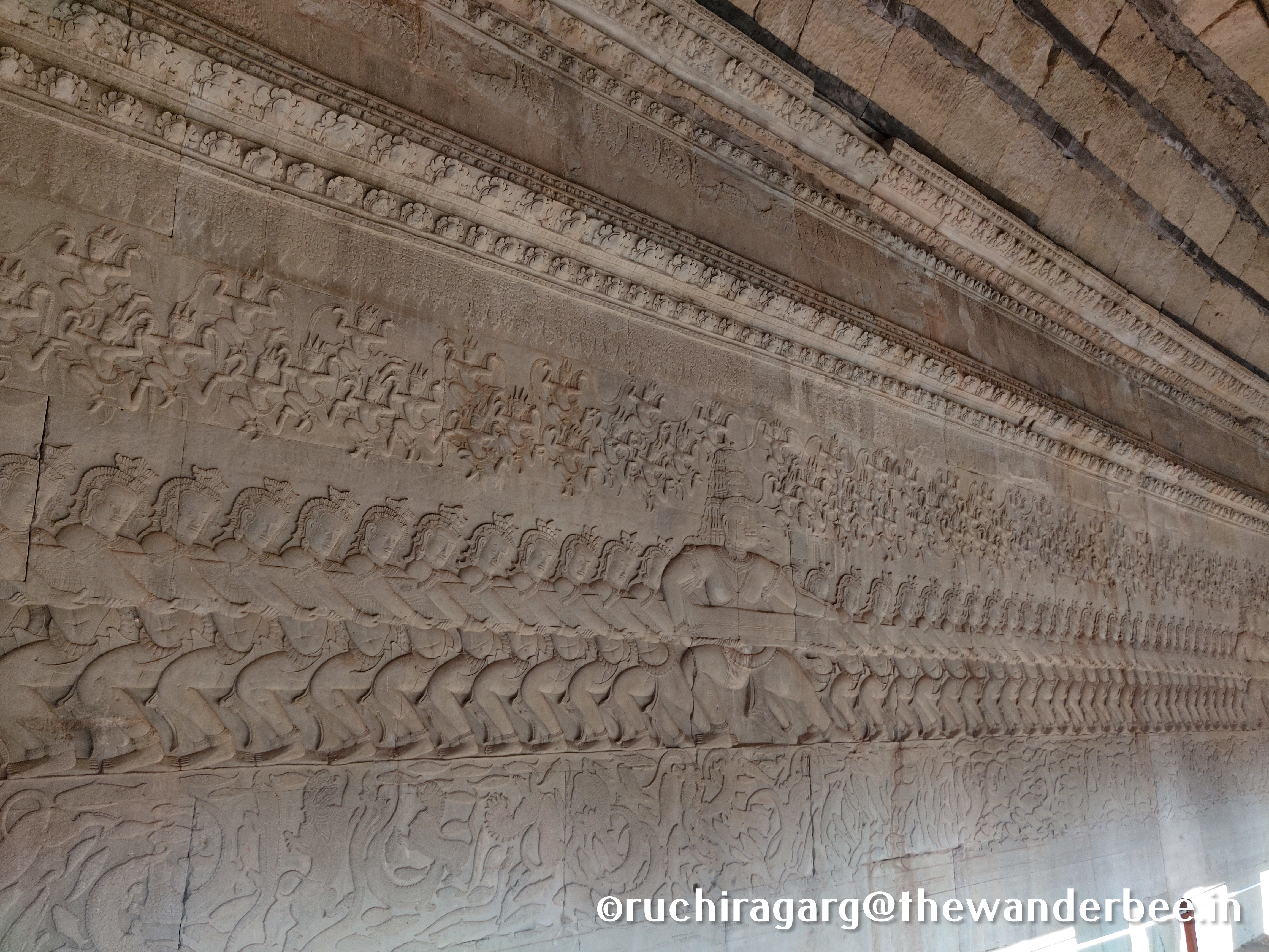 If you want to get up the main temple of Angkor Wat, there is a long flight of steep stairs. Otherwise you can access all other areas of the massive temple complex, though they are not disabled friendly. The carvings are beautiful and jaw dropping. One would take at least 2 hours to see the entire temple.
