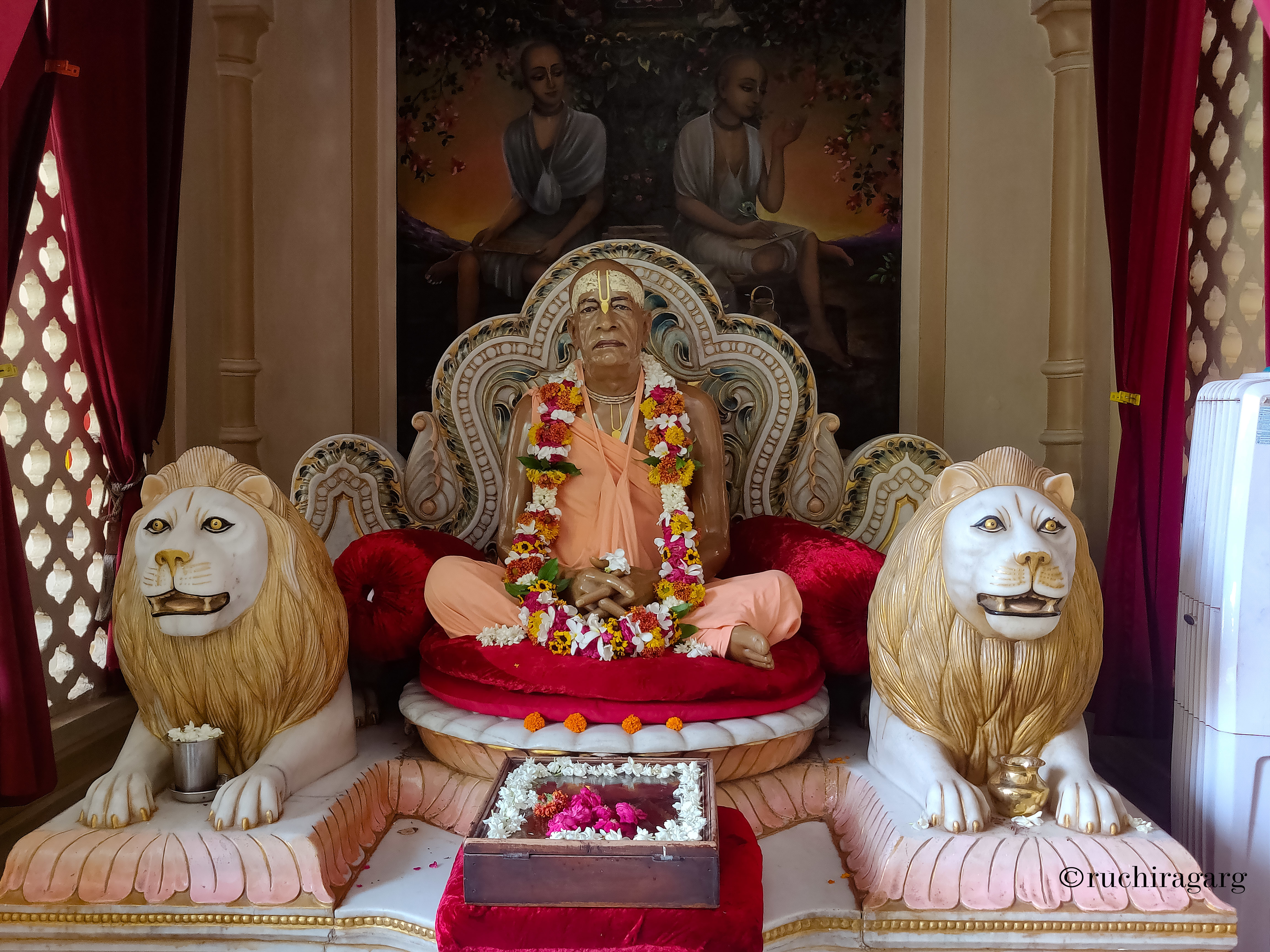 The ISKCON Krishna Balaram Mandir Vrindavan is where the founder Srila Prabhupada’s samadhi is situated. It’s at the left before one enters the main temple. The temple has a courtyard in front and has various donation offices, book stalls, prasadam stalls etc around it. The temple is very strict about its timings and is closed from 12:30 p.m to 4:30 p.m. We had reached at 11 a.m so had enough time to spend there. As with any other ISKCON temple, the deities were beautifully dressed and ornamented. There are three sections in the temple, one for Shri Krishna and Radhaji, the second one for Shri Krishna and Shri Balaram and the third one for Shri Nitai Gaur (Sri Chaitanya Mahaprabhu and his friend Sri Nityanand Mahaparabhu). On the left side of the temple is the statue of Srila Prabhupada.