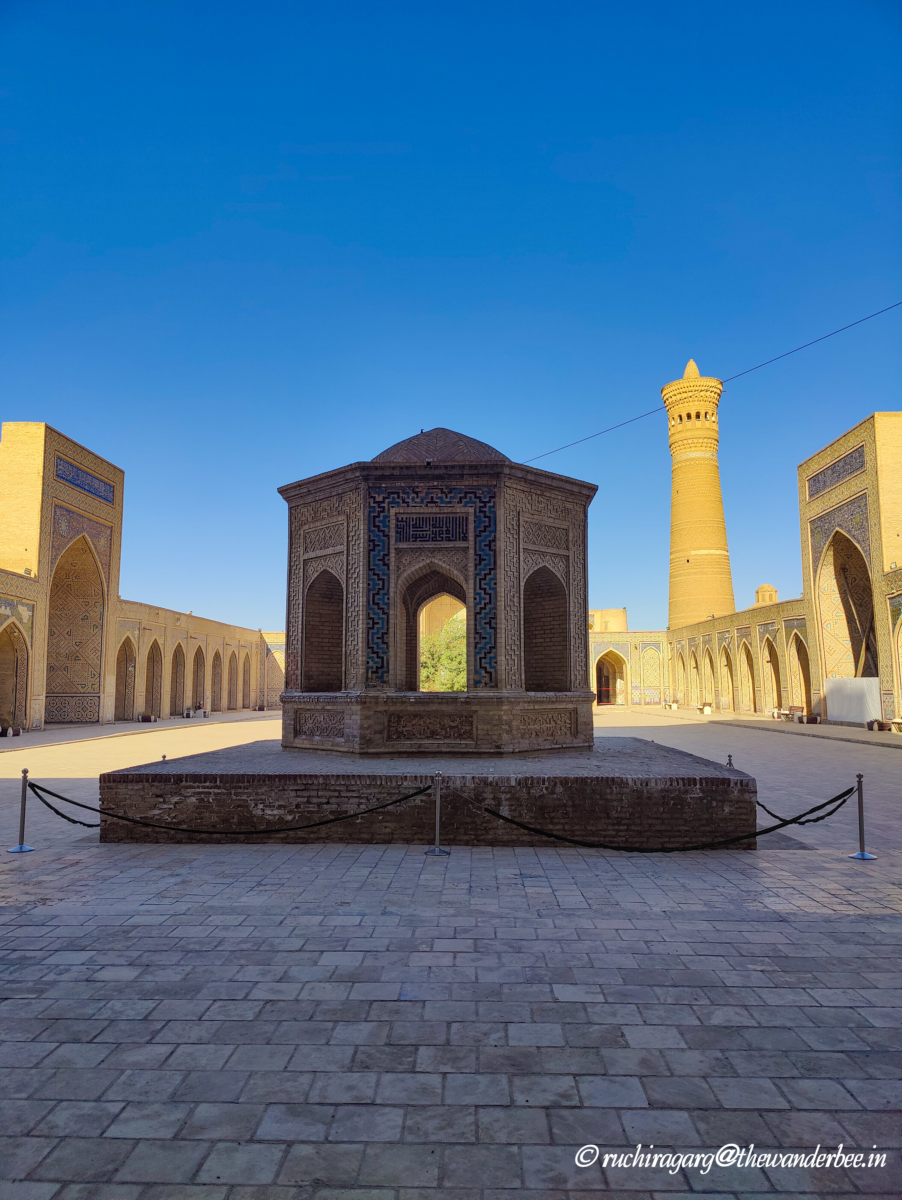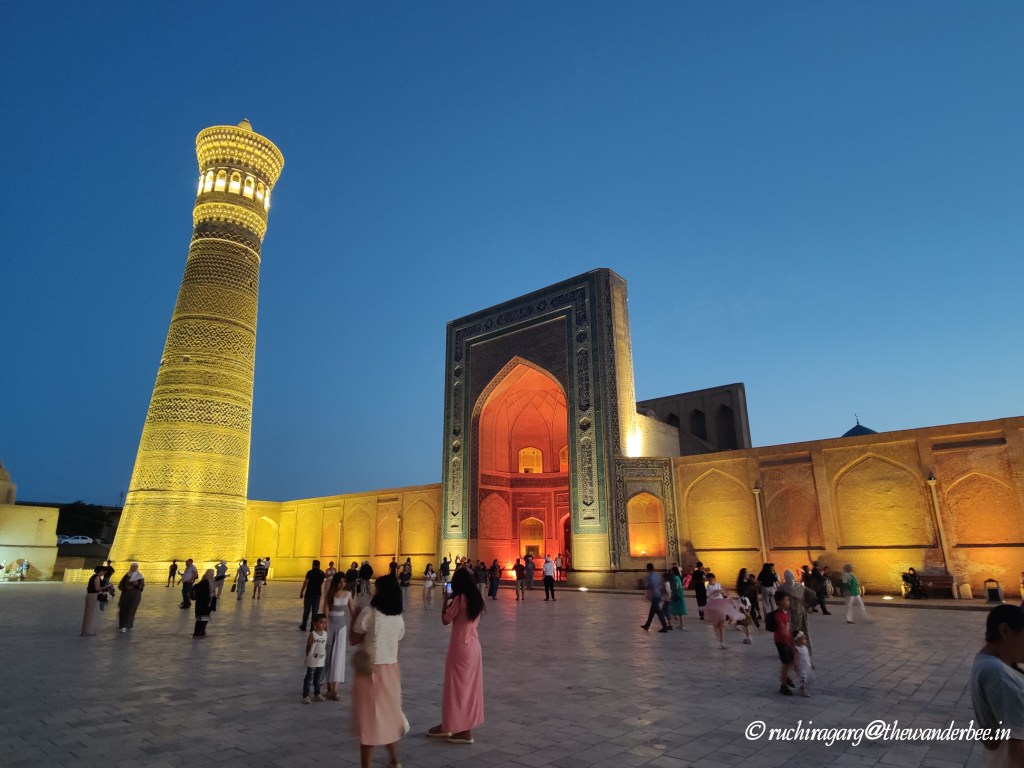 The square has a market around it and there are also a couple of hammams behind the mosque. Our hotel was a 5 minutes’ walk from the Poi Kalyan Square. The mosque, minaret and the madrasah in front of it looked majestic at night as they were beautifully illuminated with the lights and the dusky blue sky added to the ambience. No filters needed to be used to capture the beauty of the moment in the cameras. I would recommend visiting this site both during the day and night to experience the beauty in different formats. The mosque closes at 6 p.m and has a ticket for entry.