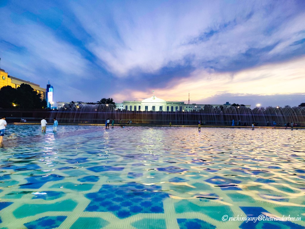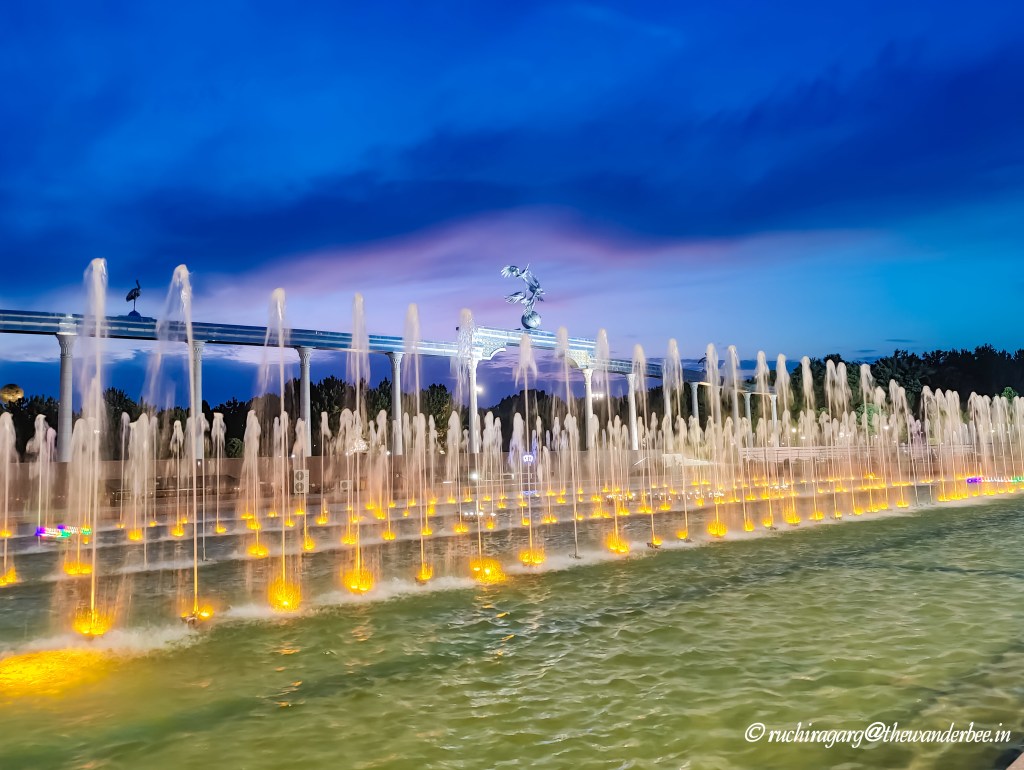 The magnificent fountains were the highlight of our trip, and we could see why they were a favorite spot for Instagram reels and photo shoots. The resplendent blue sky even at the evening hours merging with the crystal clear water of the fountains and the blue flooring served as a visual treat to the eyes.