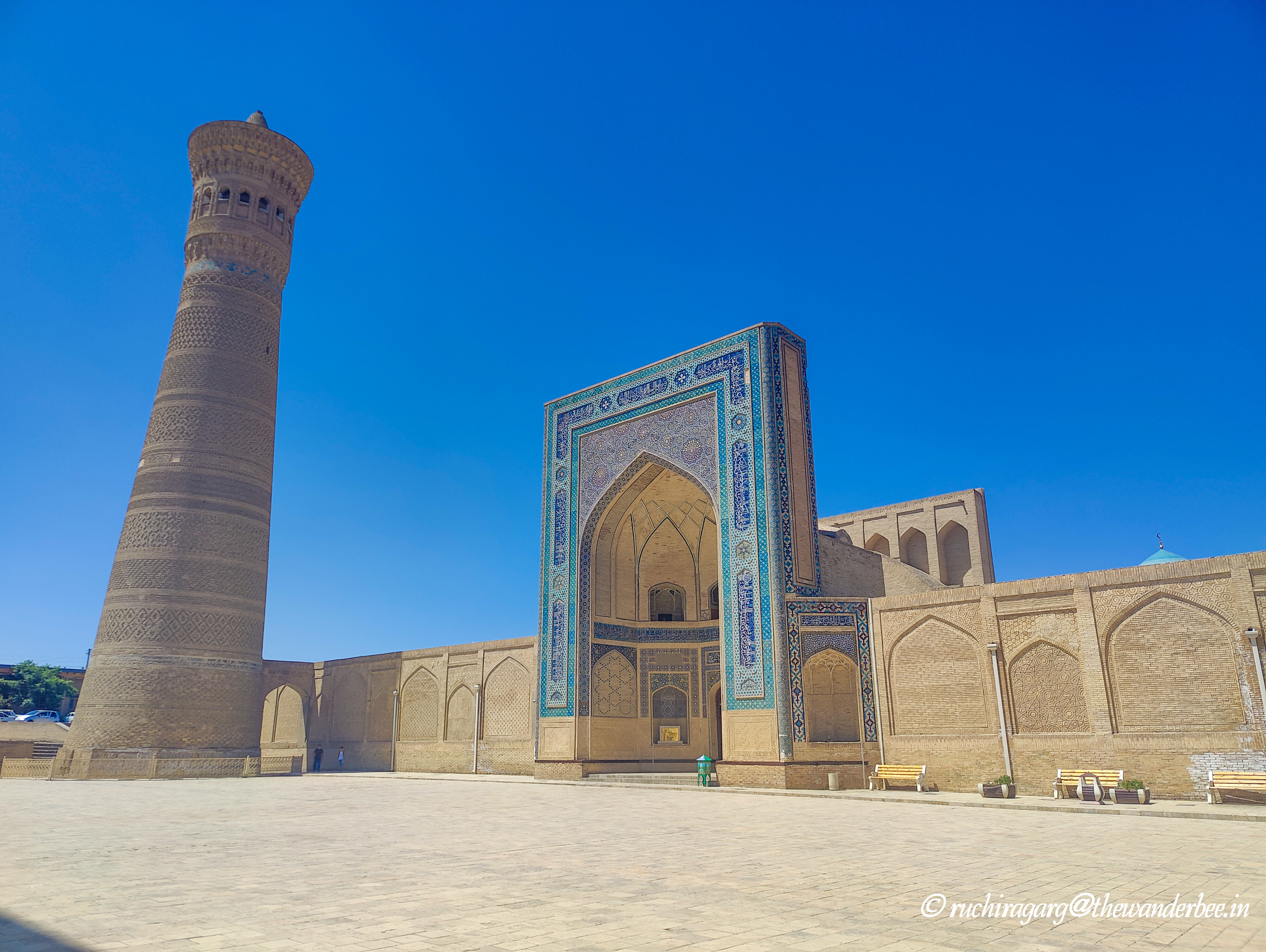 Alternatively known as Poi Kalan or Poi Kalon, it is a complex composed of three main structures: the Kalan Mosque, the Kalan Minaret, and the Mir-i-Arab Madrasah. These buildings are arranged to form a square courtyard, with the Mir-i-Arab Madrasah and the Kalan Mosque situated opposite each other. Originally, both the Kalan Mosque and Minaret were commissioned by Arslan Khan in 1121, with the construction of the renowned Kalan Minaret completed in 1127. Unfortunately, the original mosque was destroyed by Genghis Khan, leaving only the Kalan Minaret standing. In 1515 and 1535, during the reign of Shibani Khan’s nephew Ubaydullah Khan, the current Kalan Mosque and the Mir-i-Arab Madrasah were commissioned.
