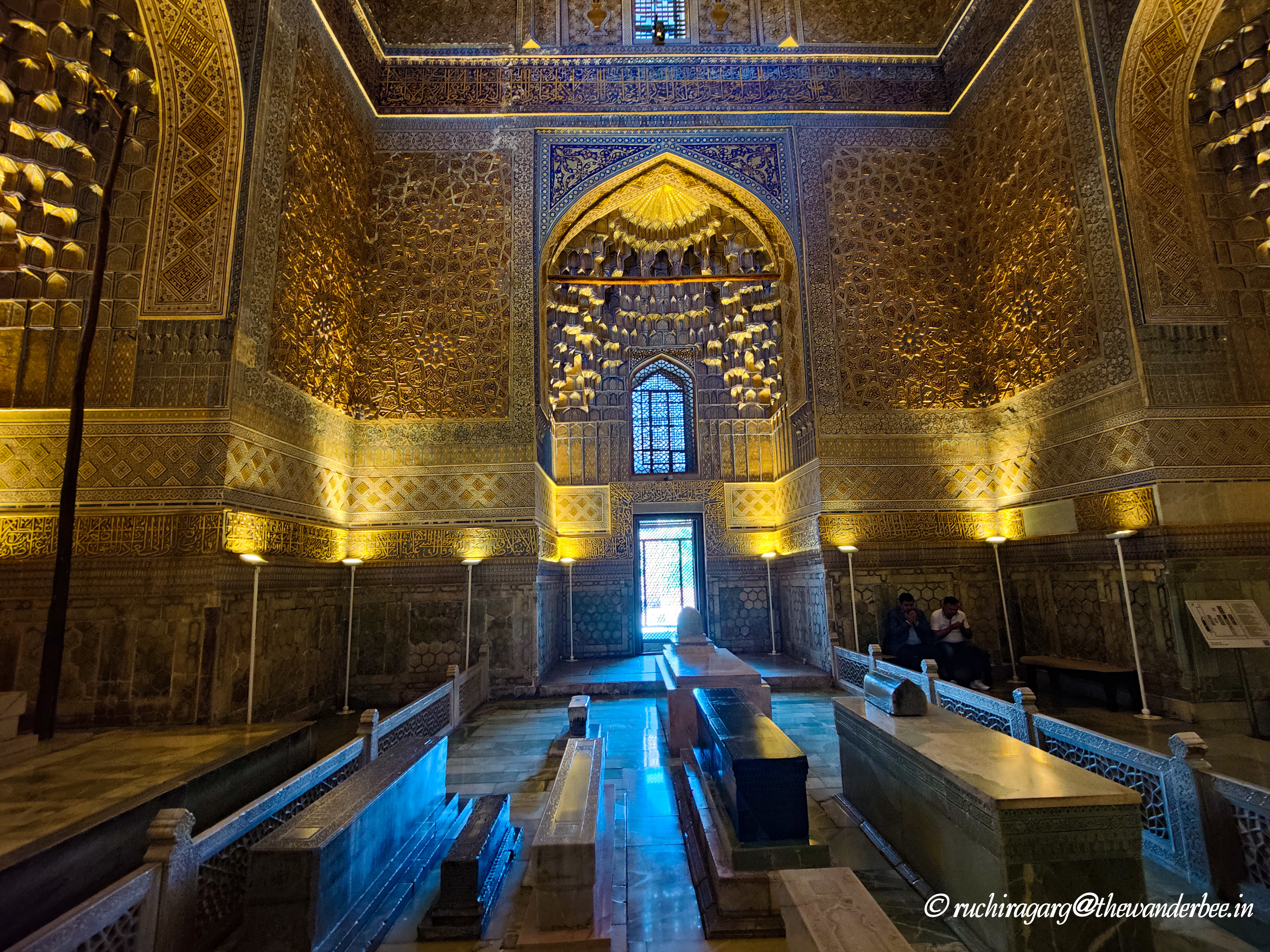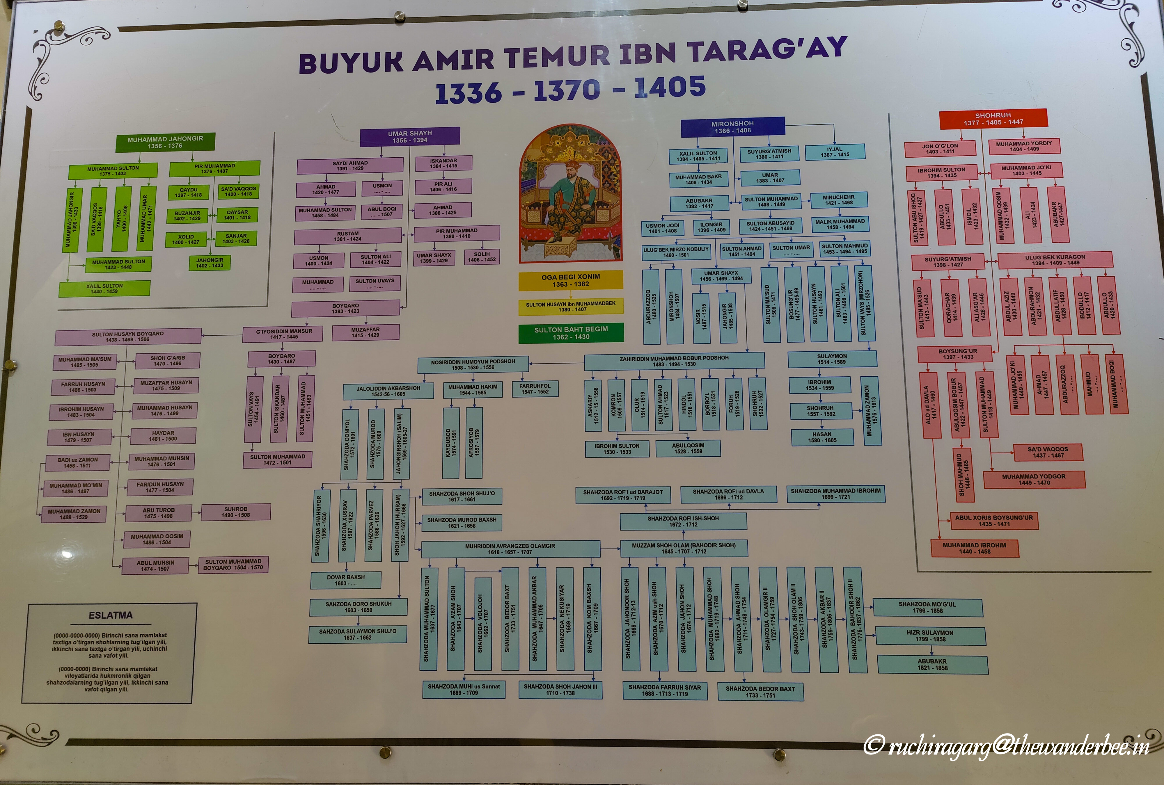 Gur-e Amir, translating to ‘Tomb of the King’ in Persian, houses the tombs of Tamerlane, his sons Shah Rukh and Miran Shah, and grandsons Ulugh Beg and Muhammad Sultan under its azure dome. Additionally, Timur’s teacher Sayyid Baraka is also commemorated within this architectural complex. The complex is impressive and is considered to be the precursor influencing the construction of Humayun’s tomb in Delhi and Taj Mahal in Agra. The interiors are magnificent and we learnt finer details like the reason why there was horse hair put up on a pole next to Sayyid Baraka’s grave. Hair of a horse put up near a grave indicates that it is the grave of a prophet, a saint or a highly respected person. The dome of the mosque has 63 spokes aligning to age of the prophet and the color blue was used on the dome as Temur’s throne was blue. We also got a glimpse of the overall Mughal family tree from which the Mughal dynasty that ruled in India had emerged. After a great lesson in history that we could all relate to, we proceeded onwards to other monuments.