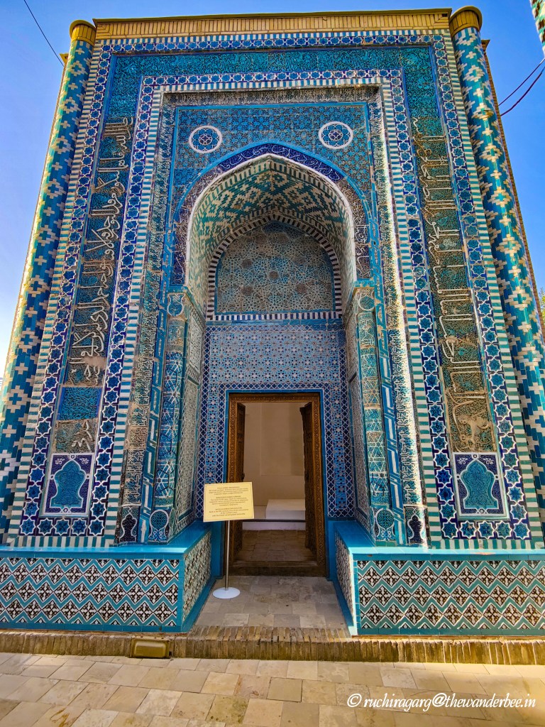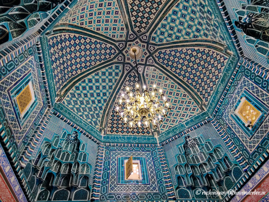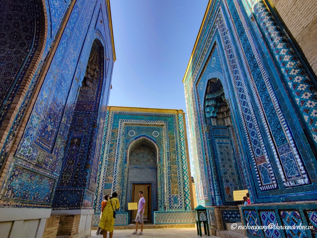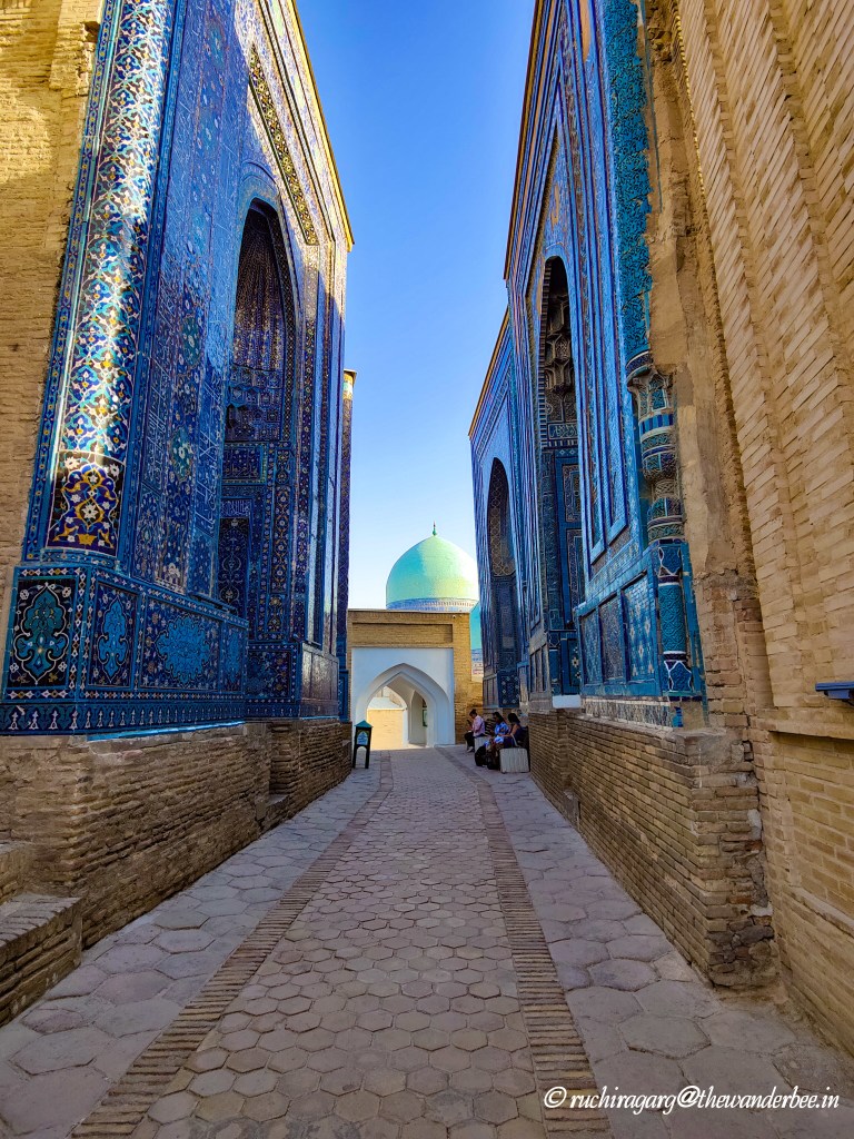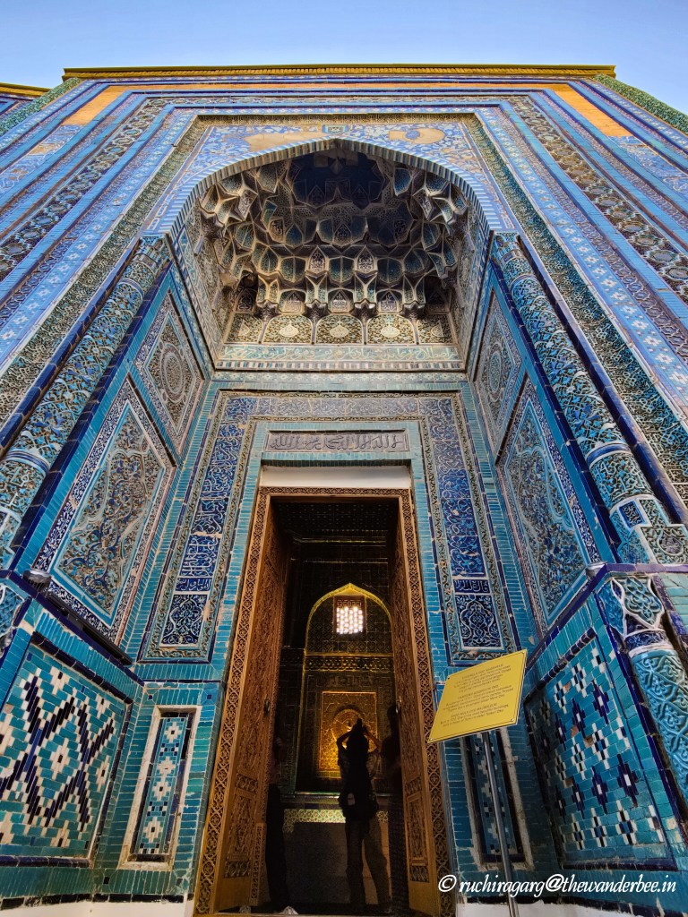 Though not originally included in our itinerary, this monument recommended to us by the locals, turned out to be the highlight of our trip to Samarkand. The Shakh-i-Zinda Ensemble ( also known as Shah-i-Zinda) features mausoleums and ceremonial structures dating from the 11th to the 15th and 19th centuries. Its name, Shah-i-Zinda, which translates to “The Living King,” stems from the legend of Qutham Ibn Abbas, a cousin of Muhammad, who is buried here. Qutham Ibn Abbas arrived in Samarkand during the 7th century Arab invasion to spread Islam.