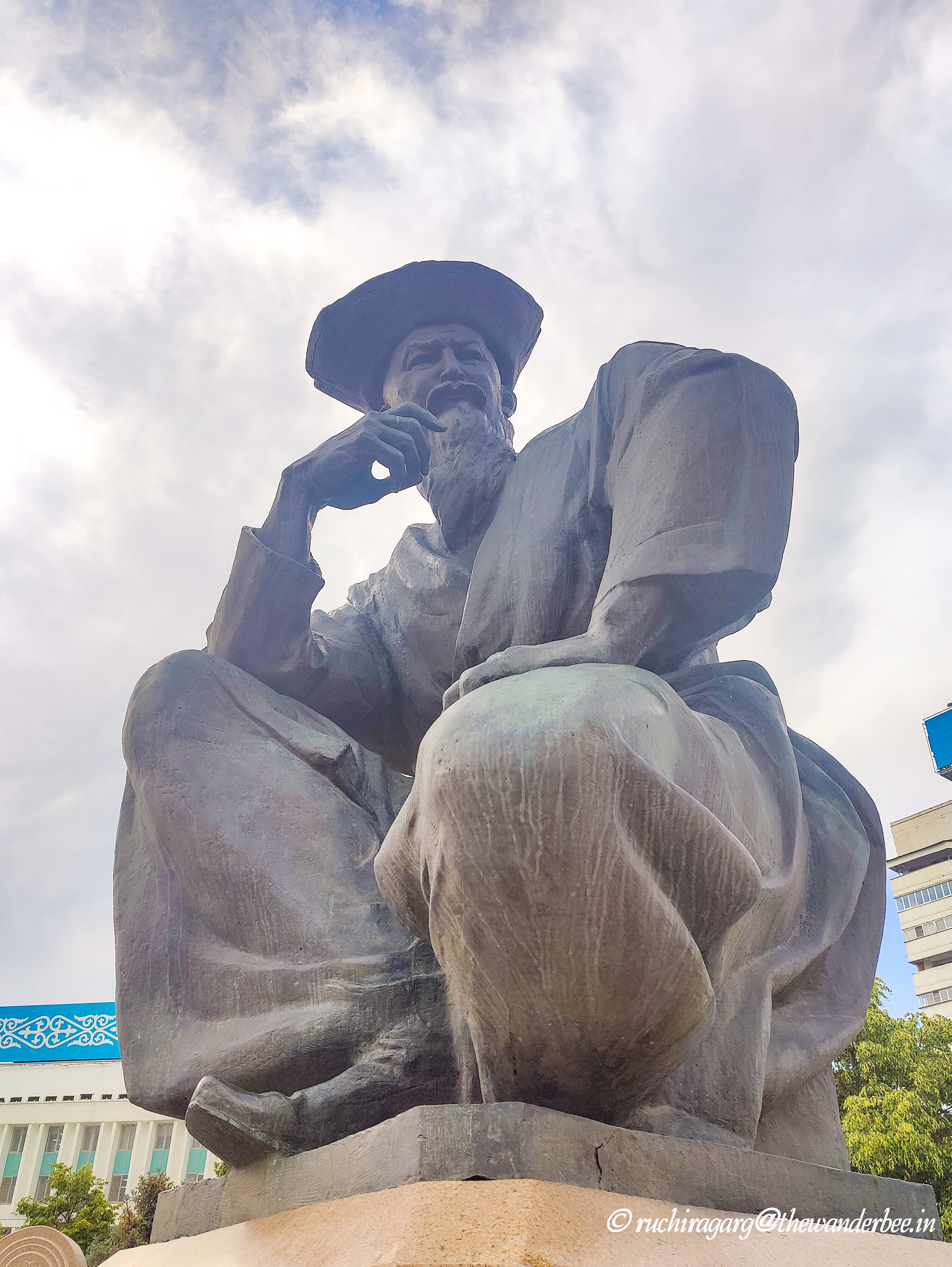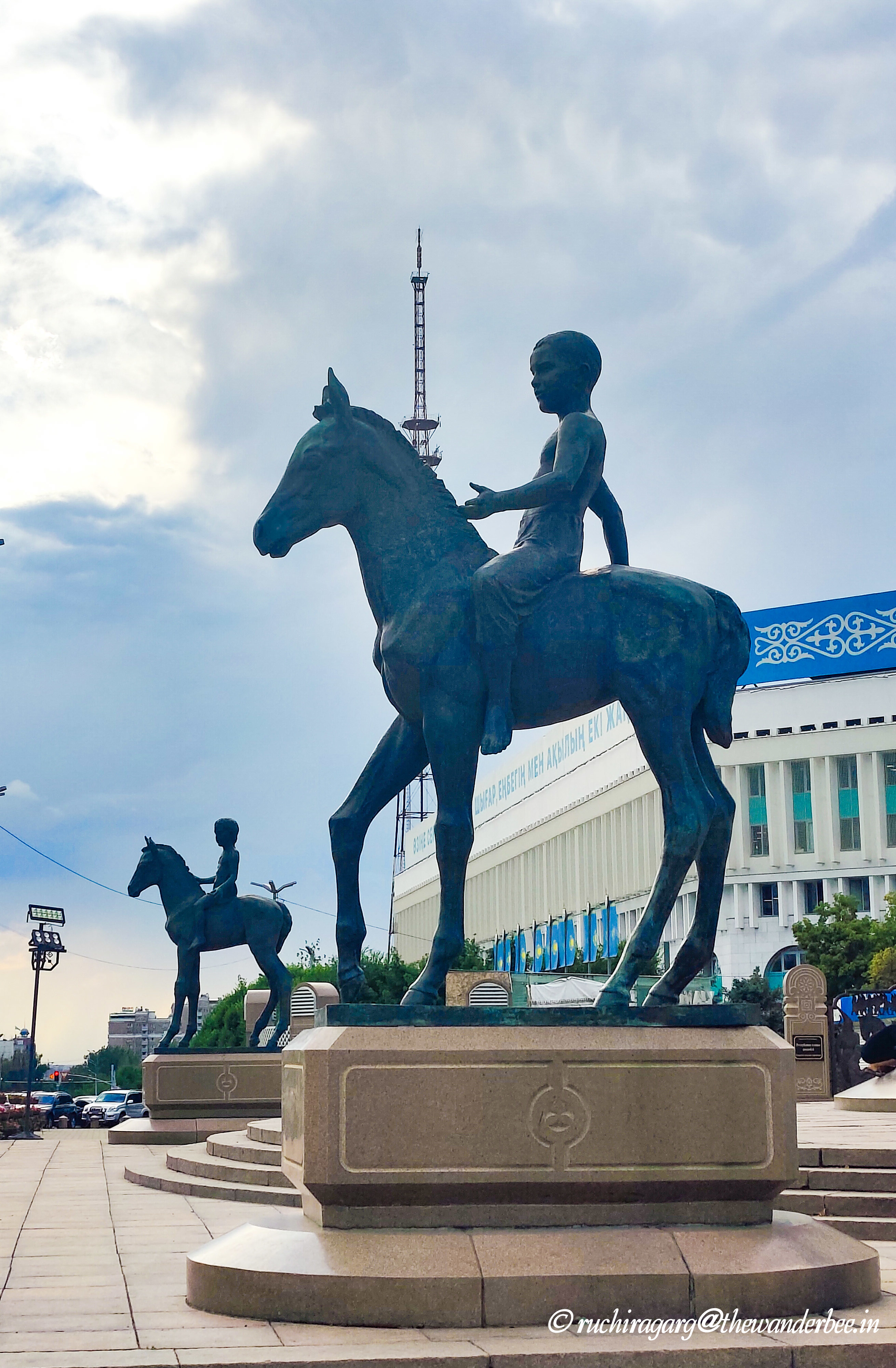 The square’s centrepiece is the Golden Warrior Monument, which symbolizes Kazakhstan’s independence, the cultural identity of its people, and Almaty’s role as the capital until 1997. Inspired by Kazakh folklore and the archaeological discovery in 1969 of the “Golden Man,” a noble from the 2nd or 3rd century BC buried in ornate gold armor, the monument stands as a testament to the nation’s rich history. However, I was more intrigued by the statues of the Kazakh man and woman sitting in different poses. I couldn’t find much background on the context of those statues.