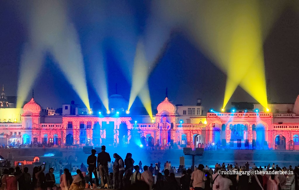 The banks of the river Saryu come alive every evening with the mesmerizing aarti at 6 p.m. Arriving early is essential to secure a good spot on the steps, as the ghat becomes very crowded. For a small donation, you can participate in the aarti and gain a closer view. On our visit, the aarti began at 6:30 p.m., followed by a captivating laser show depicting the Ramayana on the opposite bank.